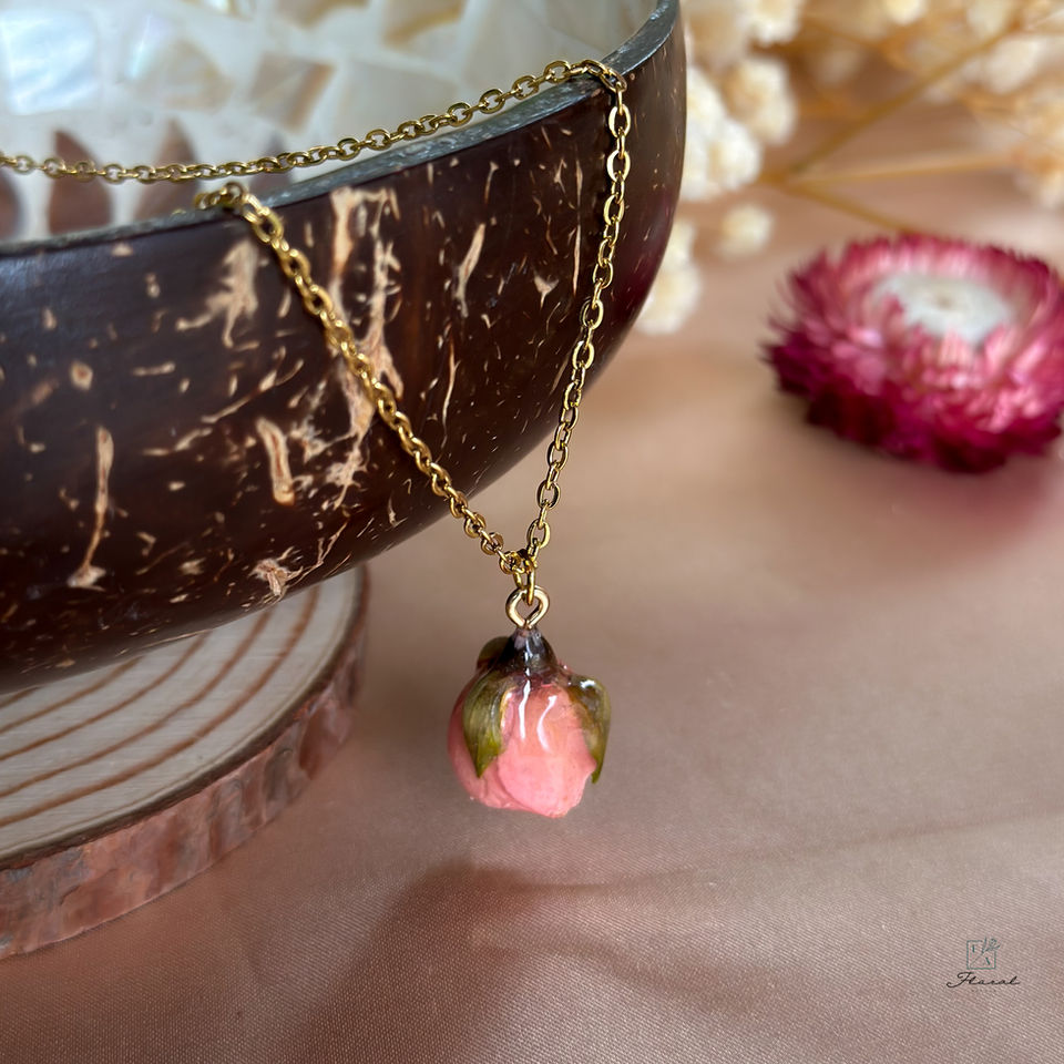 The Scarlet Dream Necklace is a mesmerizing piece of botanical jewellery, featuring a real preserved rosebud, delicately encased in a clear resin finish. This unique pendant captures the raw beauty of nature, showcasing the intricate details of the rose petals and their soft, romantic hues. Suspended from a classic gold-tone chain, this necklace radiates timeless elegance and charm, making it the perfect keepsake for nature lovers and floral jewellery enthusiasts.